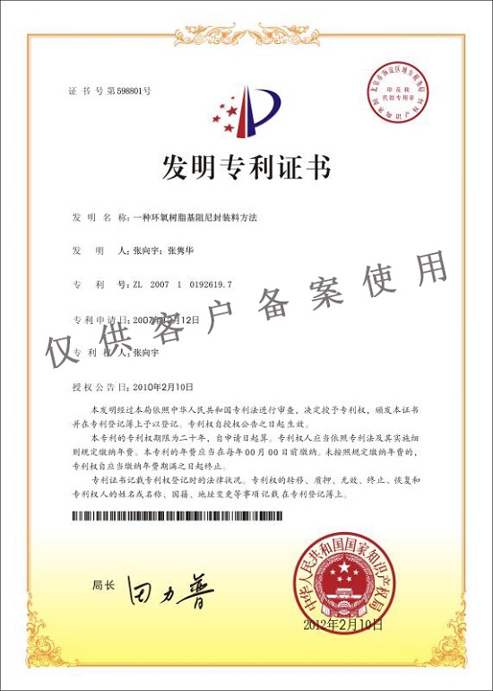 環(huán)氧樹(shù)脂阻尼封裝料發(fā)明專(zhuān)利證書(shū)