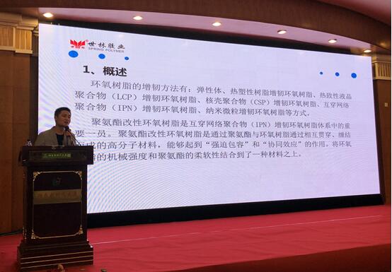 世林膠業(yè)劉工在環(huán)氧應(yīng)用技術(shù)學(xué)術(shù)交流會(huì)上進(jìn)行《聚氨酯改性環(huán)氧樹脂對(duì)環(huán)氧樹脂性能影響的研究》的演講。