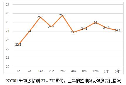 當(dāng)然通過(guò)這6個(gè)表,我們也能看出規(guī)律就是,膠粘劑產(chǎn)品高溫固化相對(duì)較為完全,后續(xù)老化數(shù)據(jù)影響不大,而常溫固化數(shù)據(jù)明顯低于高溫固化,比如XY304,常溫固化數(shù)據(jù)未25兆帕,高溫固化為28.3兆帕,而XY301室溫固化數(shù)據(jù)22.5兆帕,高溫固化為28.2,相比高出25%。