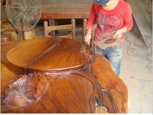 大板(柚木、花梨木、雞翅木、檀木等)在修補前,首先應(yīng)將大板里的水分風(fēng)干,好把木材內(nèi)的含水量控制在6%-12%之內(nèi),并且要將有縫隙和裂紋處的泥沙木屑清理干凈再進行灌膠或涂膠修補,如果裂縫處底部是相通的,則需要將底部先堵住,待補完膠再打磨掉。這樣修補出來的成品才相當(dāng)平整和美觀.
