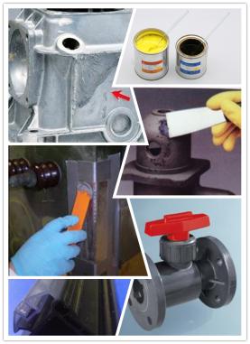 本產(chǎn)品多用金屬鑄件表面坑洞混入金屬粉末后修補,或?qū)Ω左w裂縫修補及永久性密封;金屬框架間加固處理;金屬與金屬(非金屬)之間復(fù)合膠結(jié);非金屬PVC、ABS也能膠結(jié)而且效果比一般AB膠要好很多。