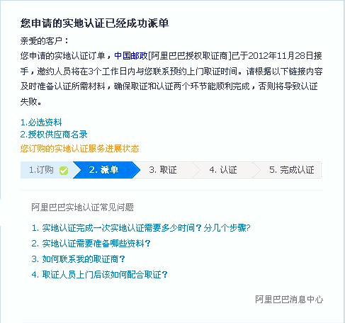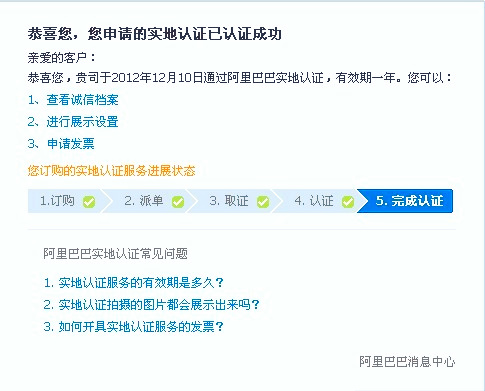 世林膠業(yè)在阿里巴巴誠信通會(huì)員歷經(jīng)九年了,謝謝阿里巴巴平臺(tái)給世林膠業(yè)的支持.2012年11月底世林膠業(yè)進(jìn)行了實(shí)地認(rèn)證申請,阿里巴巴的認(rèn)證效率非常之高,詳情請看下圖: