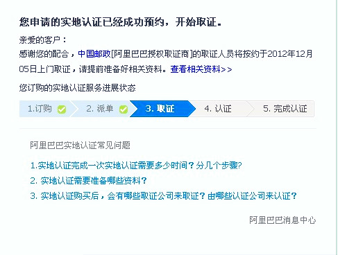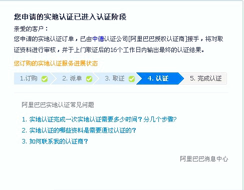 阿里巴巴實(shí)地認(rèn)證服務(wù)分為取證與認(rèn)證兩個(gè)環(huán)節(jié),取證服務(wù)有特定的取證商:中國郵政和中誠信;認(rèn)證服務(wù)有特定的認(rèn)證商:中誠信,杭州中德,北京匯華。如果你那的材料齊全,在上門取證后的16個(gè)工作日內(nèi)會(huì)有認(rèn)證結(jié)果(認(rèn)證成功或認(rèn)證失。⑶业綍r(shí)會(huì)有旺旺浮出提醒。
