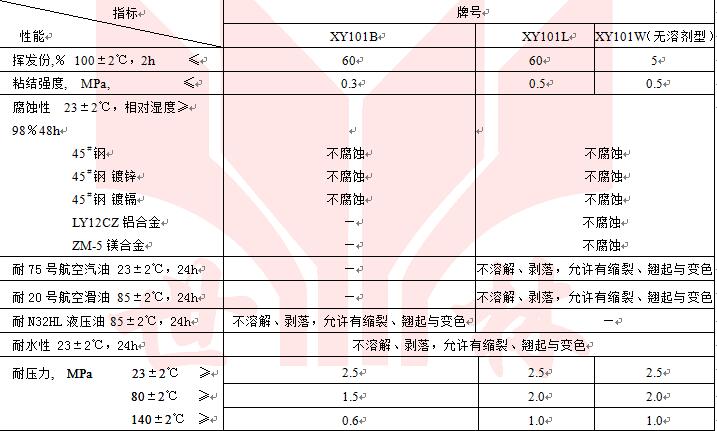 XY101各型密封膏為不干性粘彈型液態(tài)密封墊,它具有耐水、耐水與乙二醇或水與甲醇的混合物,耐汽油、噴氣燃料、礦物油、合成潤滑油、耐渦輪發(fā)動(dòng)機(jī)燃燒產(chǎn)物等,它適合于航空發(fā)動(dòng)機(jī)的附件機(jī)匣與壓氣機(jī)機(jī)匣結(jié)合面、附件機(jī)匣與附件安裝面等處的密封。也適合于其它發(fā)動(dòng)機(jī)、大型機(jī)械或設(shè)備的相關(guān)部位密封。通常其密封間隙應(yīng)小于0.04mm。但不適合于大間隙以及薄壁焊接件及沖壓件的結(jié)合面密封,也不適于帶坡度的結(jié)合面密封。其工作溫度為-50~+250℃,短期可達(dá)300℃。